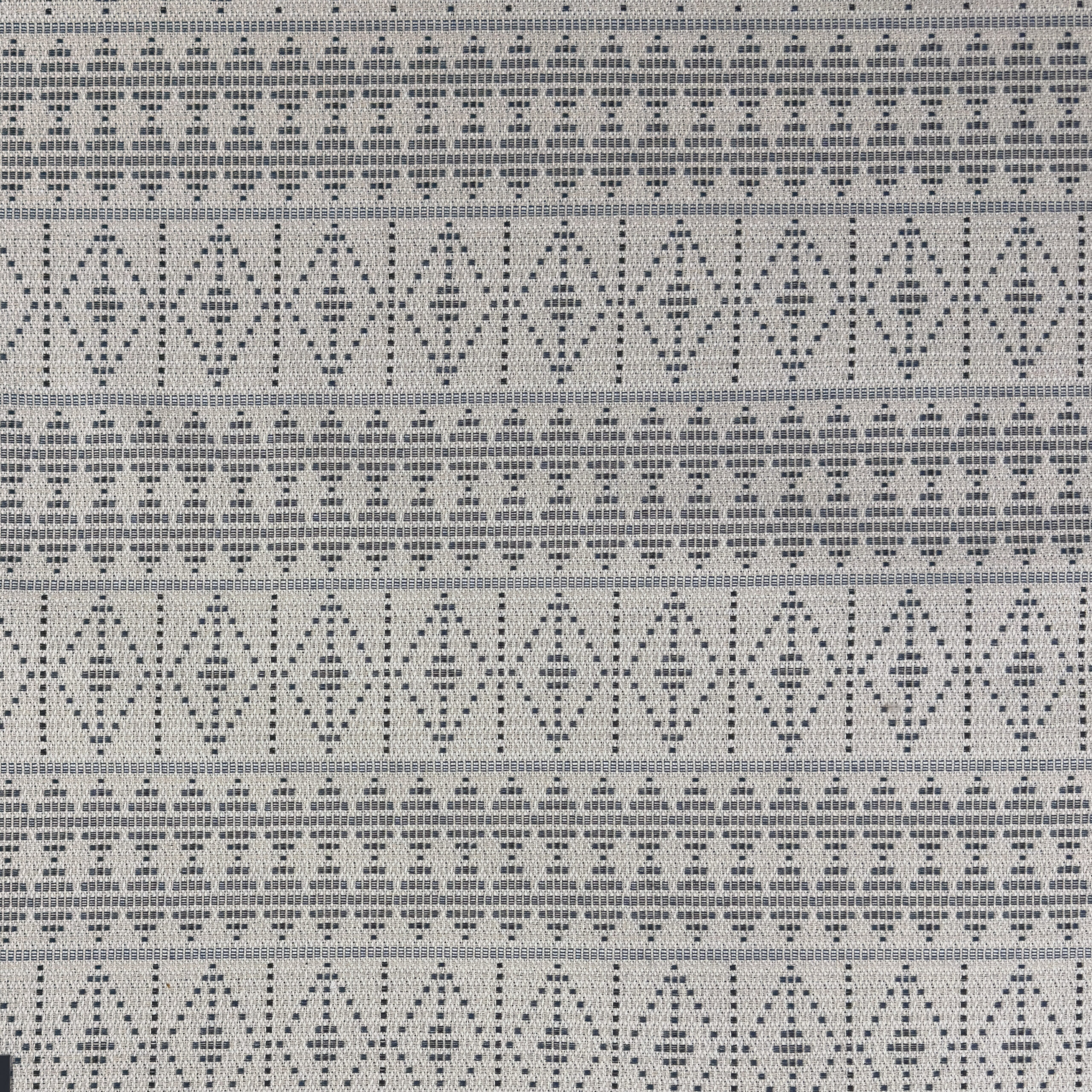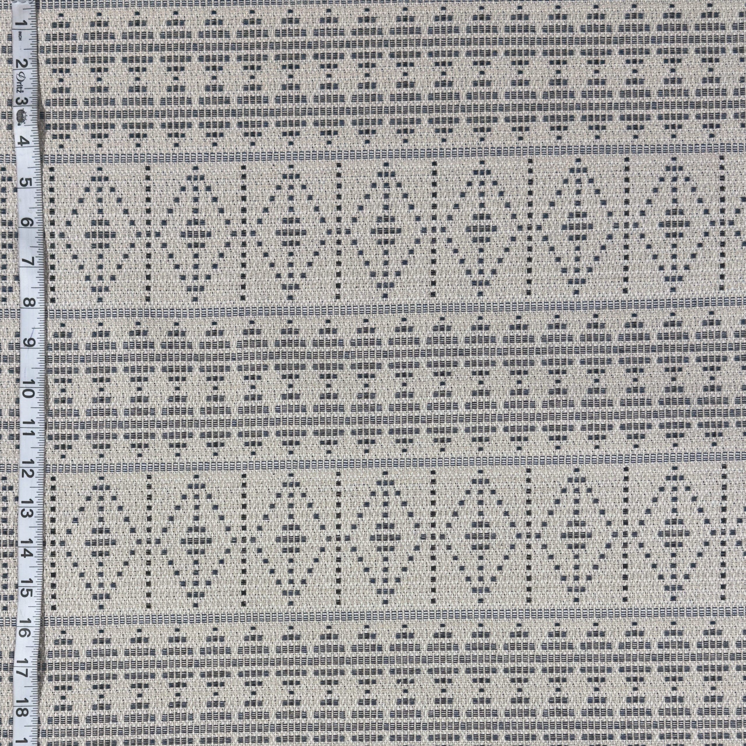 Ivory ground upholostery fabric with navy diamond stripe geometric design. Our upholstery fabrics are upcycled from high-end San Francisco workrooms, giving them a second life while keeping beautiful unused textiles out of landfills. Because these are sourced as deadstock, the exact fiber content is often unknown. To help guide your projects, we perform a traditional burn test to provide our best educated guess on fiber composition—but please note that results are approximate rather than guaranteed.